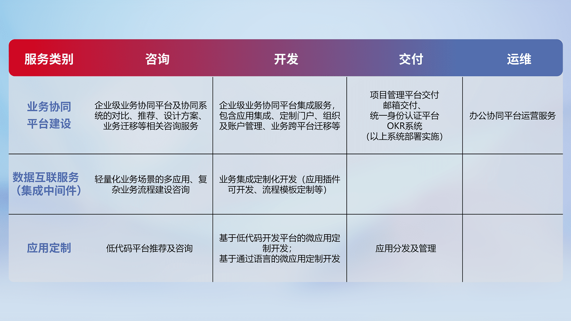 针对钉钉、、、、企微、、、IDaas等平台级产品提供产品的规划、、、、方案、、、交付、、定制化开发等服务,,,实现如统一协同办公、、、、智能客户服务、、、混合会议管理、、、、智能数据查询、、等业务场景,,,,实现数字化转型。。。。